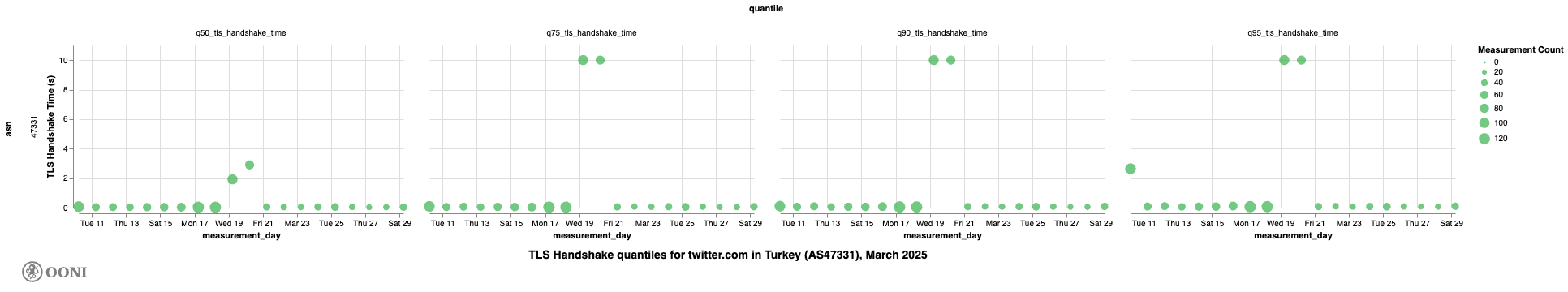 Chart: Daily TLS handshake time quantiles for twitter.com on AS47331 in Türkiye in March 2025 (source: OONI data).