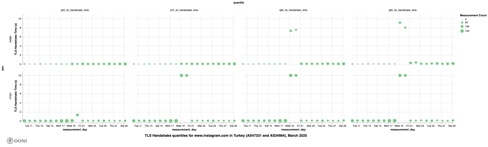Similarly, we observe high TLS handshake quantile values for twitter.com on TTNET (AS47331) and Turkcell Superonline (AS34984) during the same period.
