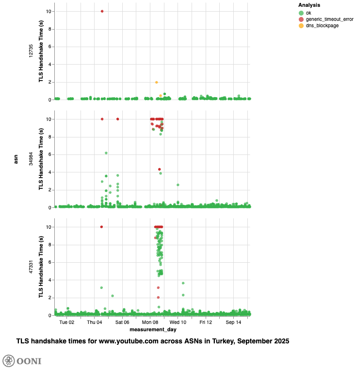 Overall, OONI data suggests that access to YouTube was throttled and blocked in similar ways and on the same networks in Türkiye during both March and September 2025.