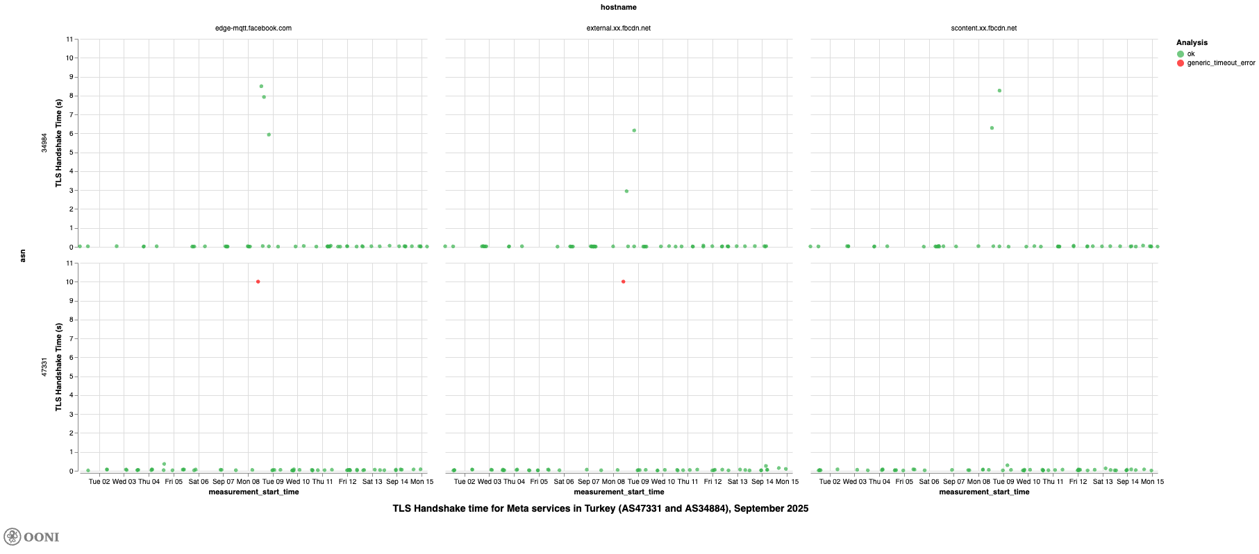 It’s worth noting, though, that we observe high TLS handshake quantile values for www.tiktok.com on TTNET (AS47331) and Turkcell Superonline (AS34984) on 8th September 2025, further suggesting that access to TikTok was throttled in Türkiye on that day.