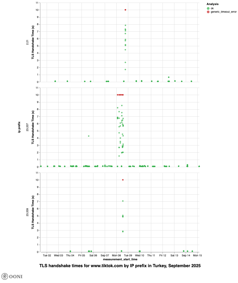 www.tiktok.comon 19th and 20th March 2025, and again on 8th September 2025 – suggesting that access to TikTok was throttled in Türkiye on these days. However, the small measurement sample for hostnames sharing the same IP prefixes aswww.tiktok.comlimits our ability to confidently confirm TikTok throttling. - Blocking of Telegram Web. Rather than throttled, OONI data suggests that access to Telegram Web (